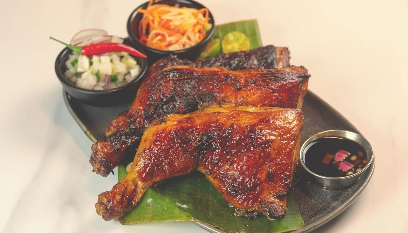 Charred Lemongrass Chicken quarter leg, soy sauce, calamansi | Atchara (pickled papaya), ensaladang pipino (cucumber salad), toyomansi